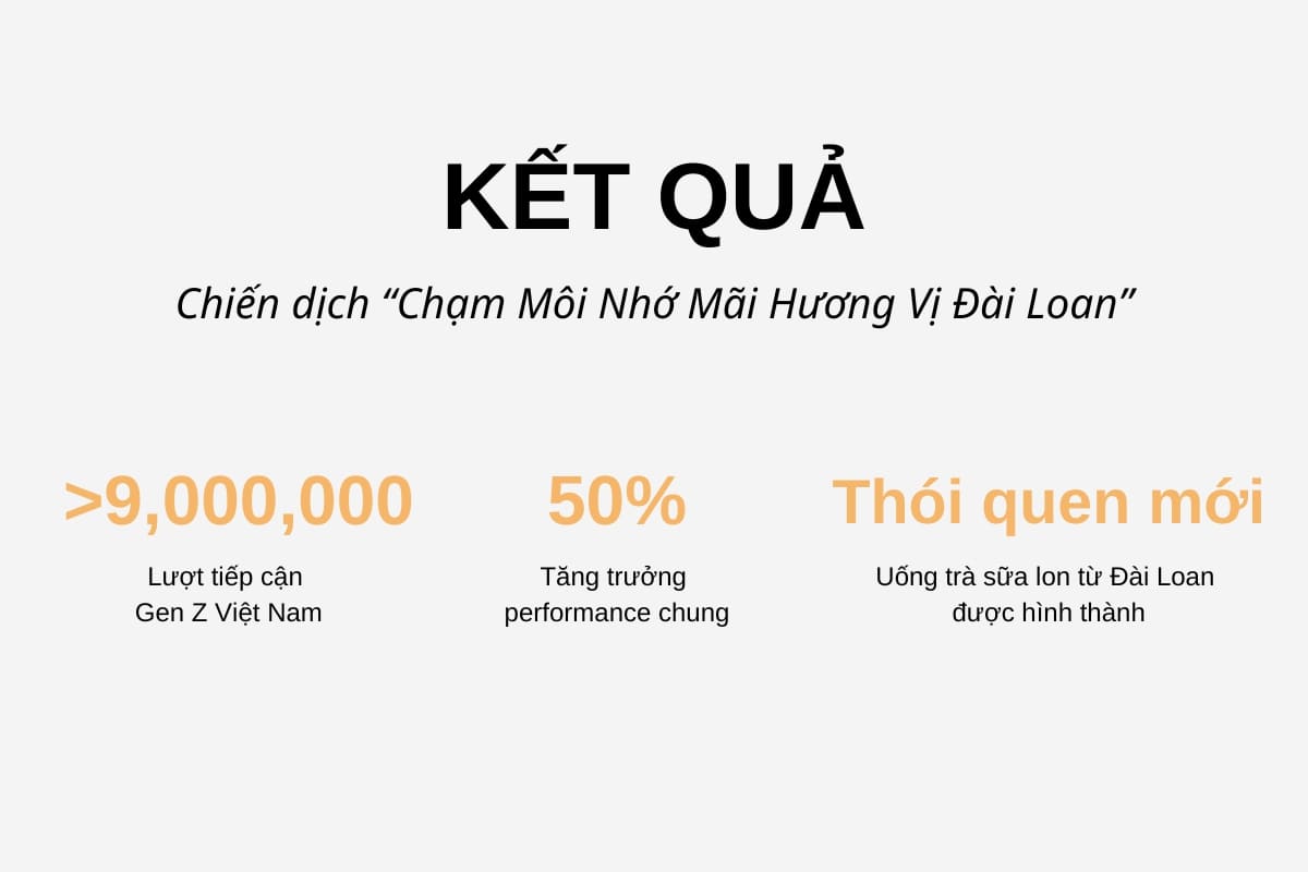 Thông qua chiến dịch “Chạm Môi Nhớ Mãi Hương Vị Đài Loan”, thương hiệu đã tiếp cận được hơn 9 triệu Gen Z tại Việt Nam, tăng 50% performance chung. Một thói quen mới được hình thành từ việc uống trà sữa lon ngon như trà sữa bình thường và xuất phát từ Đài Loan.