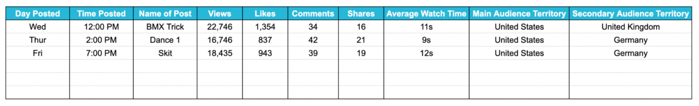 Theo thời gian, thông tin này có thể rất có giá trị. Bạn có thể sắp xếp thông tin này theo lượt xem hoặc lãnh thổ và sử dụng nó để khám phá những thời điểm tốt nhất để đăng trên TikTok.